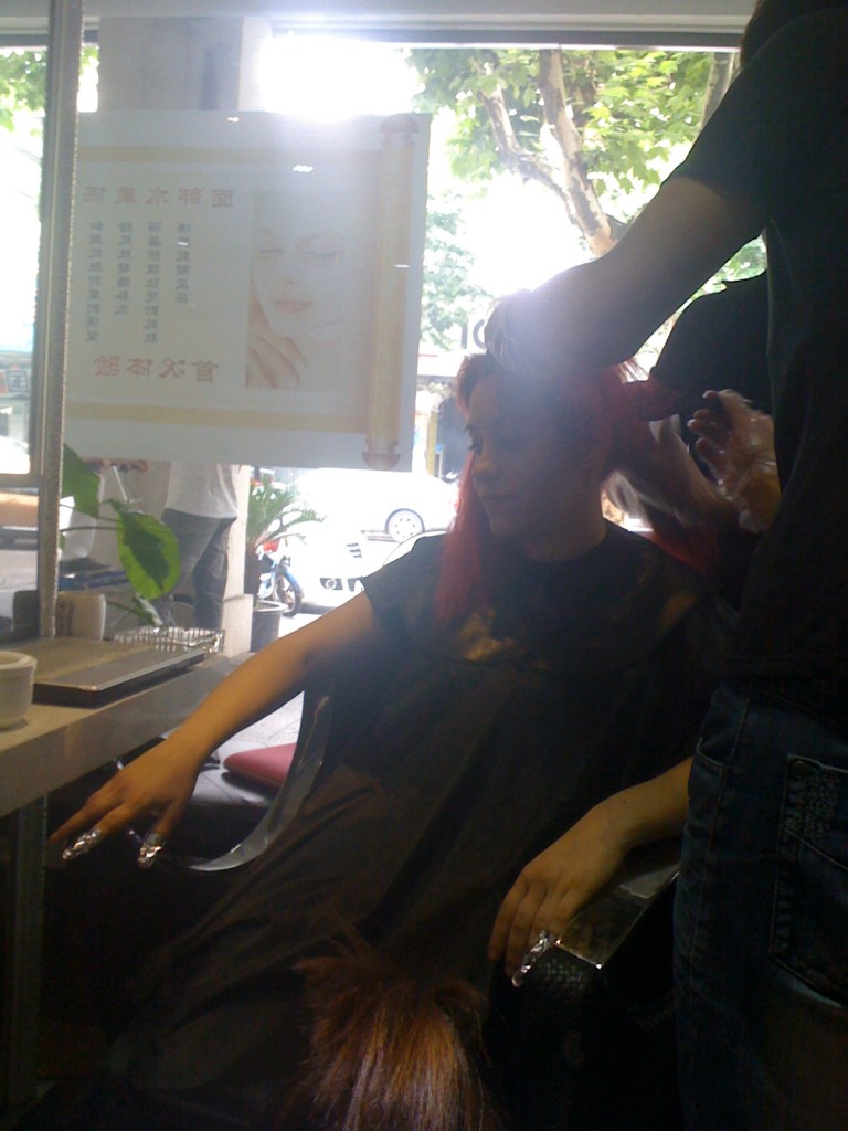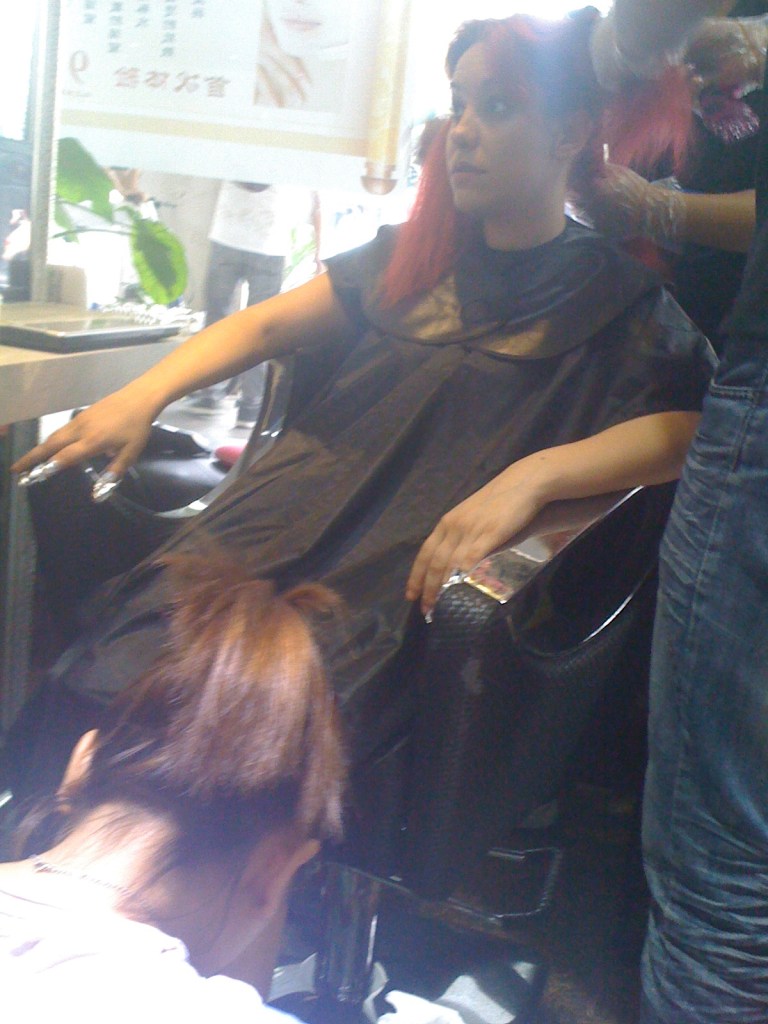 Da dove cominciare? Una persona normale farebbe tutto in ordine ma io, invece, faccio tutto secondo la logica chi ha meno confusione mi avrà come cliente per prima. E così, dopo una veloce capatina dall’estetista, mi fiondo dal parrucchiere. Mi accolgono con la solita faccia contentissima, il mio hair stylist preferito si avvicina, mi chiede se voglio la solita piega, rispondo di no e in due secondi dieci persone si attivano. Chi mi toglie la giacca, chi mi prepara il the, chi mi mette la mantella, chi provcura il computer con le foto dei modelli, chi mi comincia a fare i massaggi. No, non sono una star, siamo in Cina qui tutti si prodigano ai tuoi piedi.