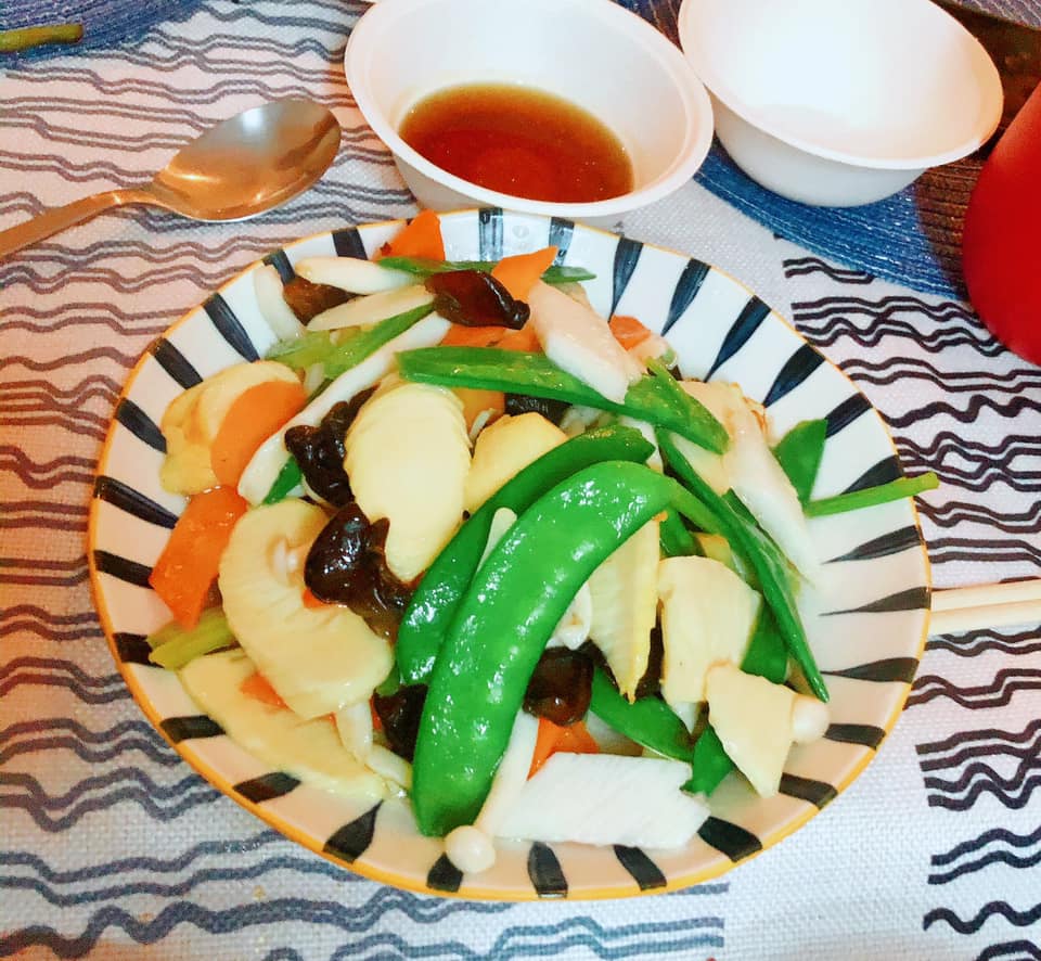 Salta i funghi in un’altra padella. Aggiungi i germogli di bambù e friggi insieme. Versa il cavolo cinese e continua a saltare in padella aggiungendo altro olio.