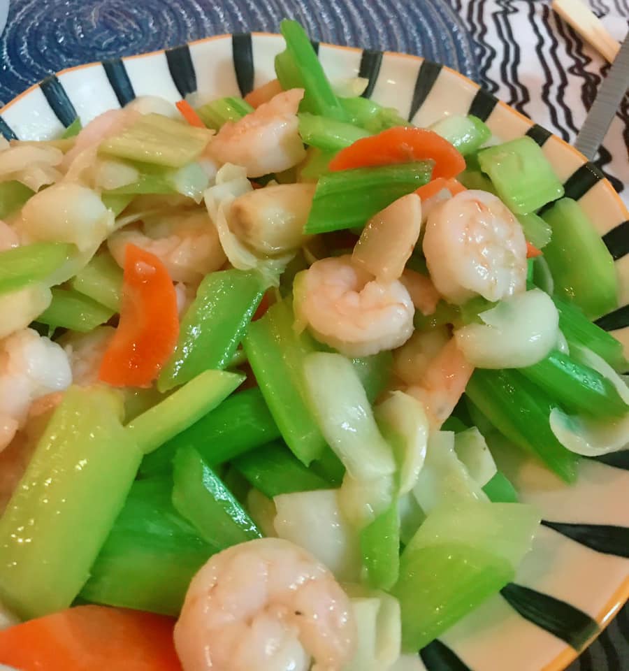 Scaldare l’olio in una padella, aggiungere lo zenzero e l’aglio tritato, rosolare, versare i gamberi e friggere fino a quando cambia il colore.