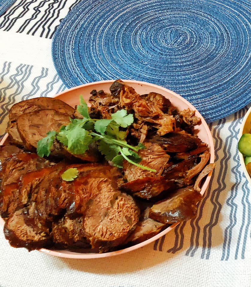 Preparare la salsa. Aggiungere in una pentola l’acqua, lo zenzero, l’anice stellato, la cannella e le foglie di alloro e portare a ebollizione. Abbassa la fiamma al minimo, copri e lascia sobbollire per 15 minuti. Dopo 15 minuti, rimuovere l’anice stellato e la cannella. Aggiungere lo zucchero di canna, il vino, la salsa di ostriche, la salsa di soia leggera, la salsa di soia scura, l’aceto, lo scalogno e il succo d’arancia. Cuocere lentamente a fuoco medio basso (circa 20-30 minuti). Se necessario, togli il coperchio verso la fine per ottenere una salsa leggermente più densa. Raccogli tutte le spezie solide con una schiumarola e lascia raffreddare completamente la salsa.