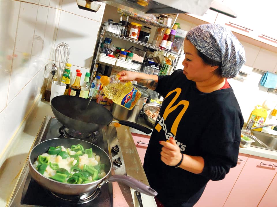 Aggiungere il composto preparato inizialmente con l’amido, continuare a friggere e mescolare bene. (Lascia un pò di composto con l’amido da parte).