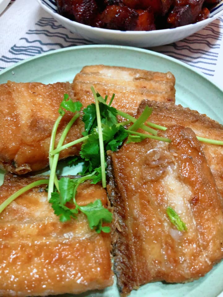 Maiale (tre pancette non molto grasse e tre grasse) (il maiale è migliore se con la pelle)