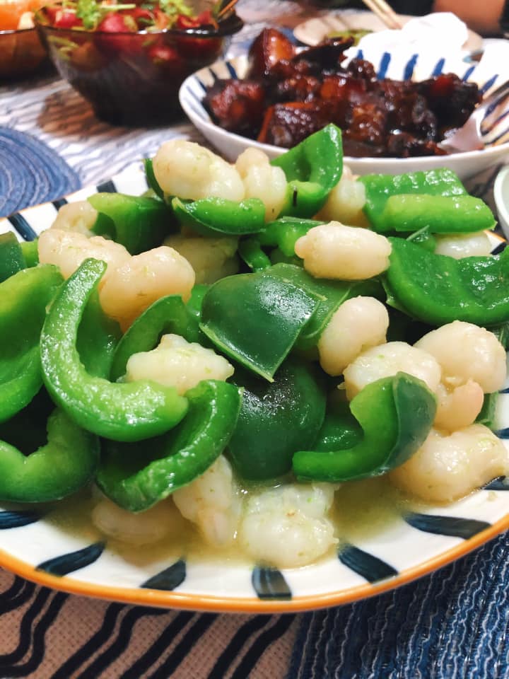 Aggiungere il peperone verde e saltare insieme con i gamberi.