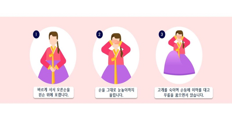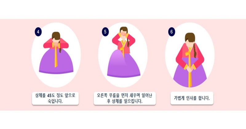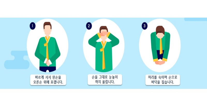 Non lasciatevi ingannare dalla semplicità di come vi ho raccontato del Sebae, questo rito, infatti è più complesso di quello che sembri. Ecco come ci si inchina per il capodanno coreano. Iniziamo dalla postura: mettere le mani sull’ombelico con la mano sinistra sopra la mano destra per gli uomini e per le donne con la mano destra sopra la mano sinistra.