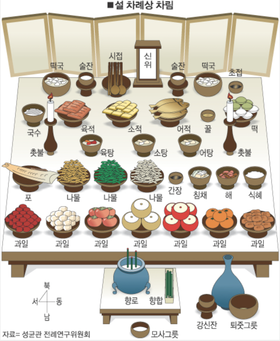 Il modo di servire i piatti varia a seconda della regione e della famiglia, ma è fondamentale impostare le pietanze sul tavolo in 5 file. Il lato con lo shinwi si trova dietro la prima fila dove normalmente sono posizionate le zuppe di torte di riso, nella seconda fila si trovano carne e pesce, nella terza fila diversi tipi di zuppe, nella quarta fila si trovano invece contorni come verdure e kimchi, e anche salsa di soia, mentre nell’ultima fila sono posizionati dessert, frutta (anche secca).