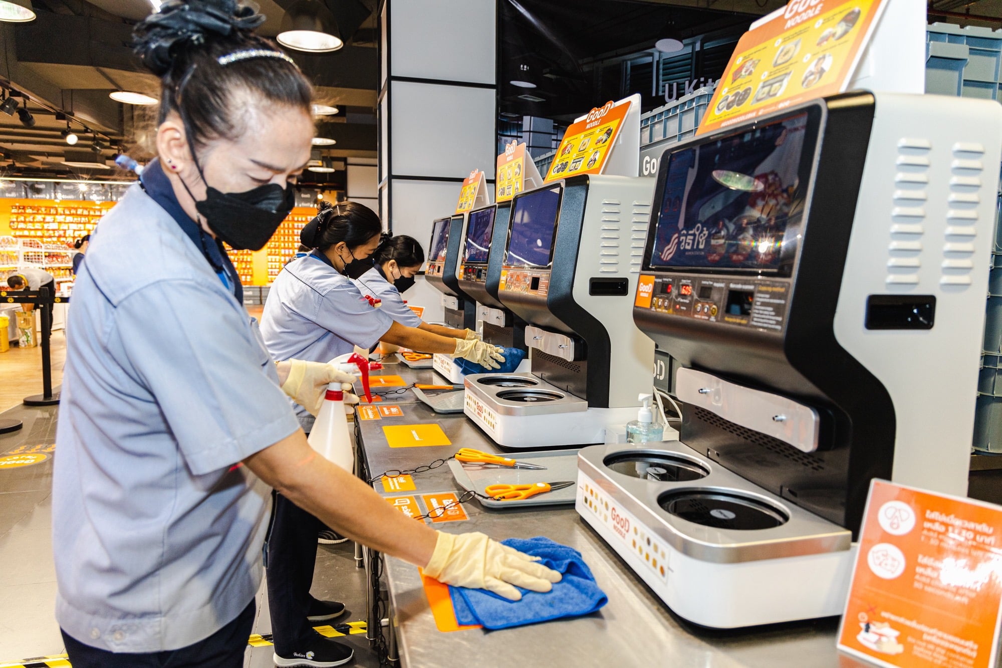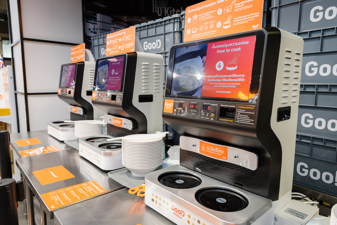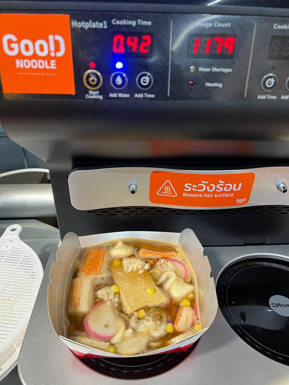 Una volta scelti i condimenti si va verso la cassa con il vassoio, si paga e si riceve una speciale ciotola di carta con un fondo di alluminio. A questo punto ci si dirige verso le macchinette che servono per assemblare i noodle e cuocerli. Dopo avere premuto il pulsante di avvio la macchina eroga il giusto livello di acqua sugli spaghetti istantanei mentre la padella a induzione inizia a cuocere il cibo. E il pasto è pronto!