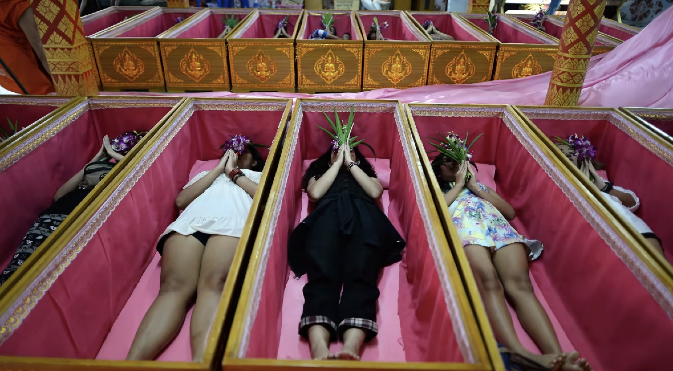 In Thailandia esiste un rito chiamato norn long sop, sdraiarsi nella bara. In diversi templi viene proposto come cerimonia per sciogliere la sfortuna e rinforzare la fortuna personale, con una sequenza di canti, posizione del corpo e benedizioni finali.